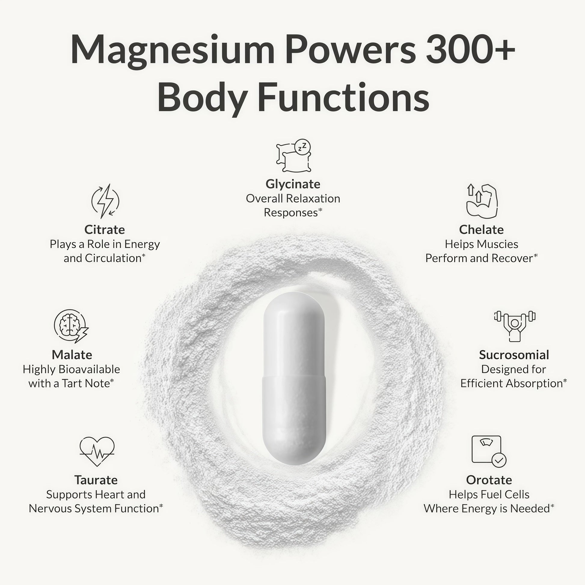 By combiningall 7 key forms of magnesium, you can support awider range of essential bodily functions, helping your body stay balanced, resilient, and performing at its best.*